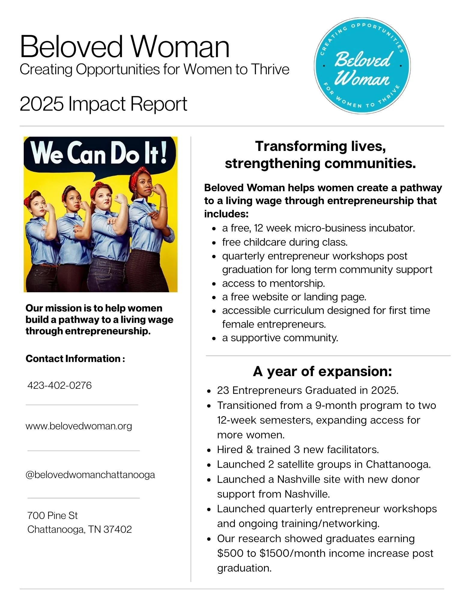 We believe that inside of every woman lives a Beloved Woman: strong, courageous and capable.